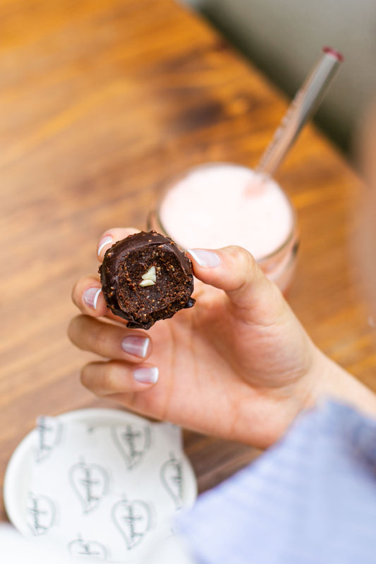Snacks cremosos, frescos y hechos a mano. Hechos con dátiles, frutos secos y chocolate.
